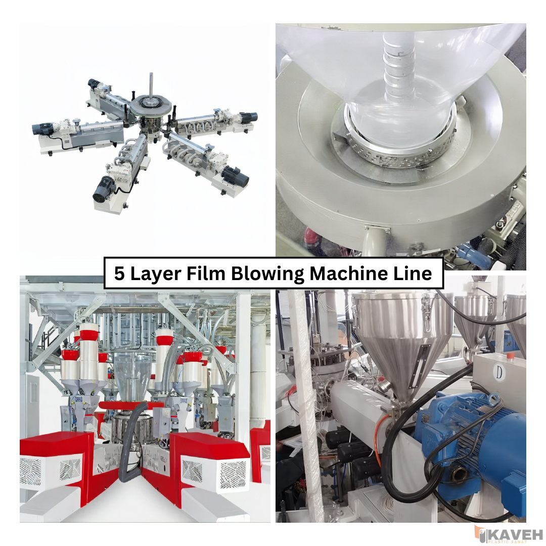 The Film Blowing plastic film production machine is one of the advanced pieces of equipment in the plastic industry, used for producing 5-layer and 7-layer plastic films. This machine utilizes extrusion technology to create thin plastic films with specific properties. A combination of different raw materials can be used in this machine, and the choice of materials depends on the final application of the film.